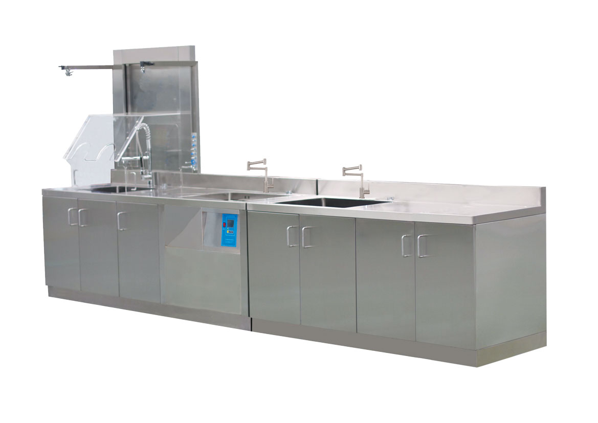 多功能器械清洗中心是根据国内医院消毒供应中心目前的实际需求,开发的一款多功能的组合式清洗设备。搞设备应用范围广泛,适用于器械类(外科手术器械如手术刀、钳子、镊子、各种试管、玻璃管、以及弯盘、圆桶等)管道类(微创手术器械)以及硬式内镜等各种医疗用品的清洗。全套设备由浸泡漕、初洗槽、酶洗槽、超声清洗槽、漂洗槽、末洗槽、沥水台、干燥台、润滑槽等各种模块自由组合而成,用户可以根据各自的实际需求自由选配。设备配置有超声波清洗机、蒸汽清洗机、清洗防护装置以及排风系统等,在确保清洗效果的同时,保证了操作人员在清洗消毒过程中的自身安全。